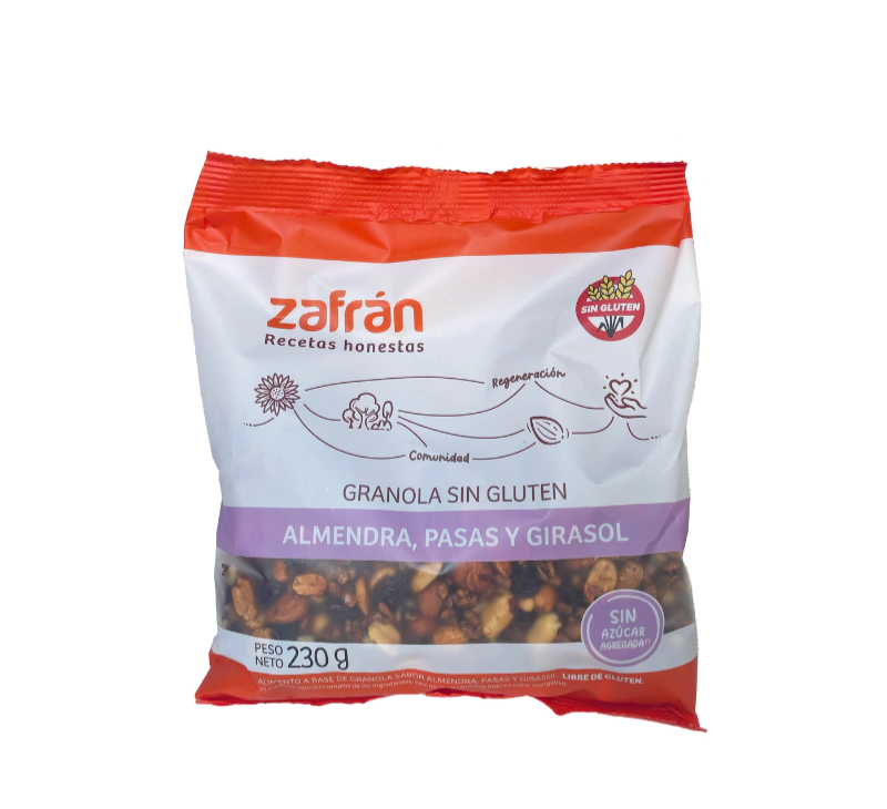 Granola Zafrán Sin Gluten x 230g Almendras, Pasas y Girasol.